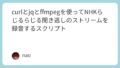 ffmpeg -y -http_seekable 0 -i ${temp} -vn -bsf aac_adtstoasc -acodec copy "${OUTDIR}/${temp2}.m4a"curl -s “https://www.nhk.or.jp/radio-api/app/v1/web/ondemand/series?site_id=PMMJ59J6N2&corner_site_id=01“