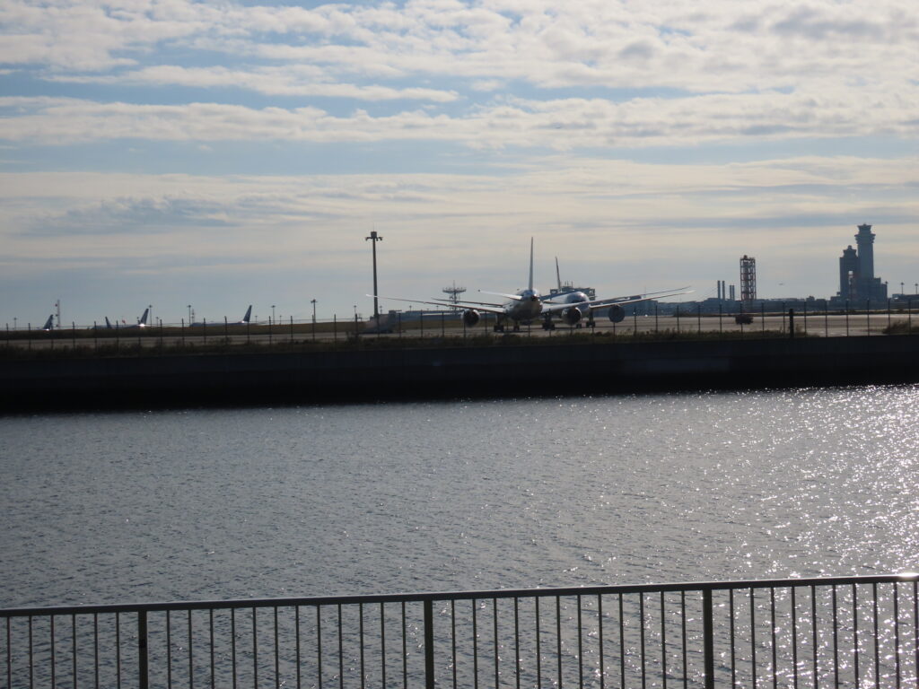 ANAの旅客機が近くで眺められます。逆光ですね。