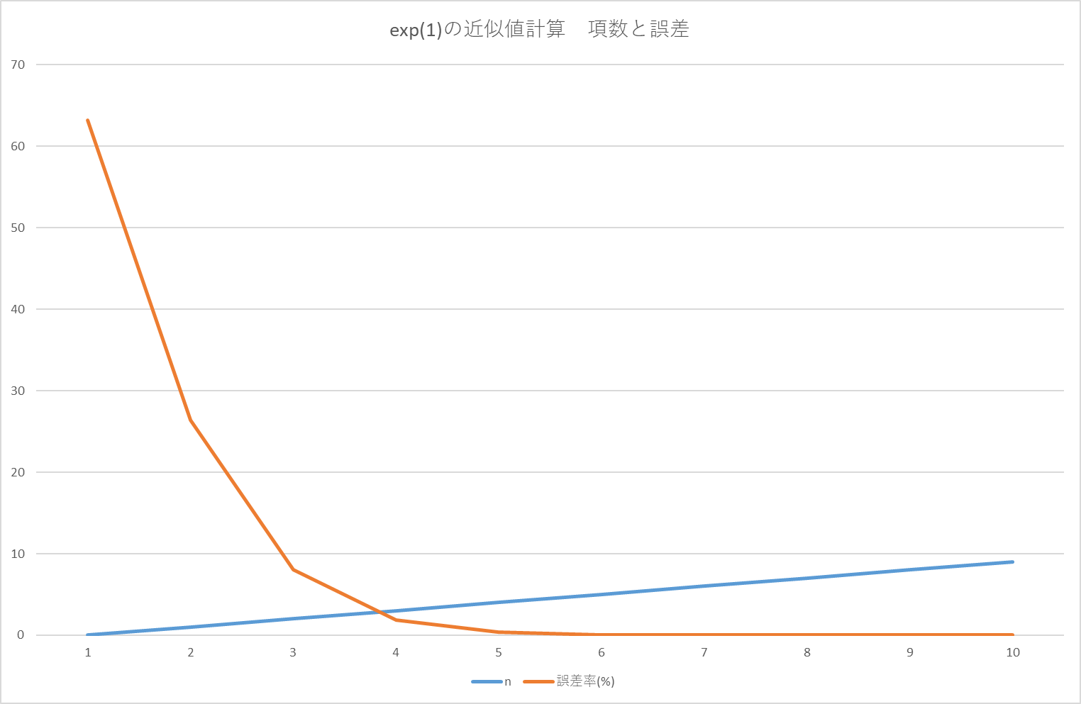 n項はnの増加で急速に減少するので、その状況をExcelを使って数値計算してみよう。