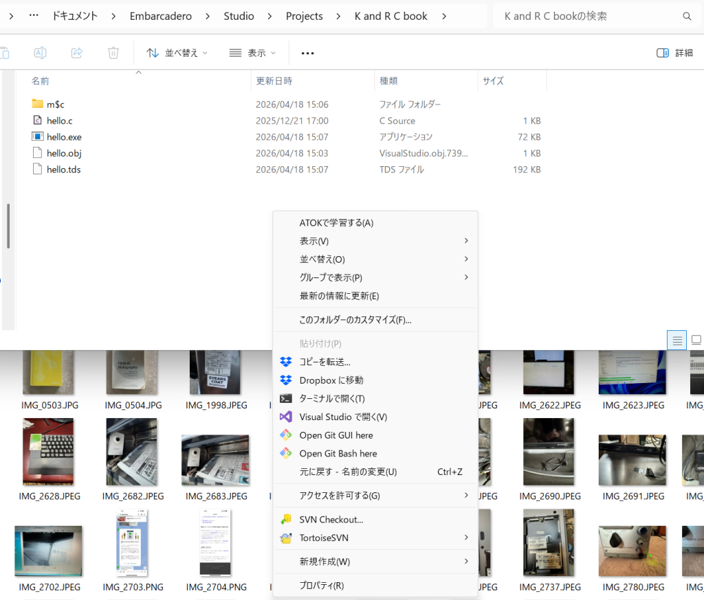 ですね。このままbcc32に食わせてみましょう。このファイルhello.cのあるフォルダーで、右クリックからの“Open Git Bash here”でおけです。