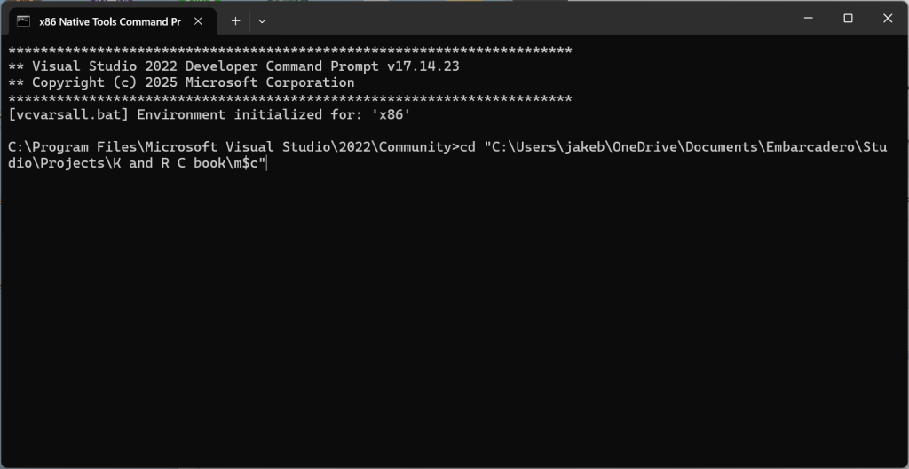 jakeb@Orbit-11 MINGW64 ~/OneDrive/Documents/Embarcadero/Studio/Projects/K and R C book