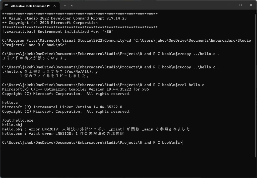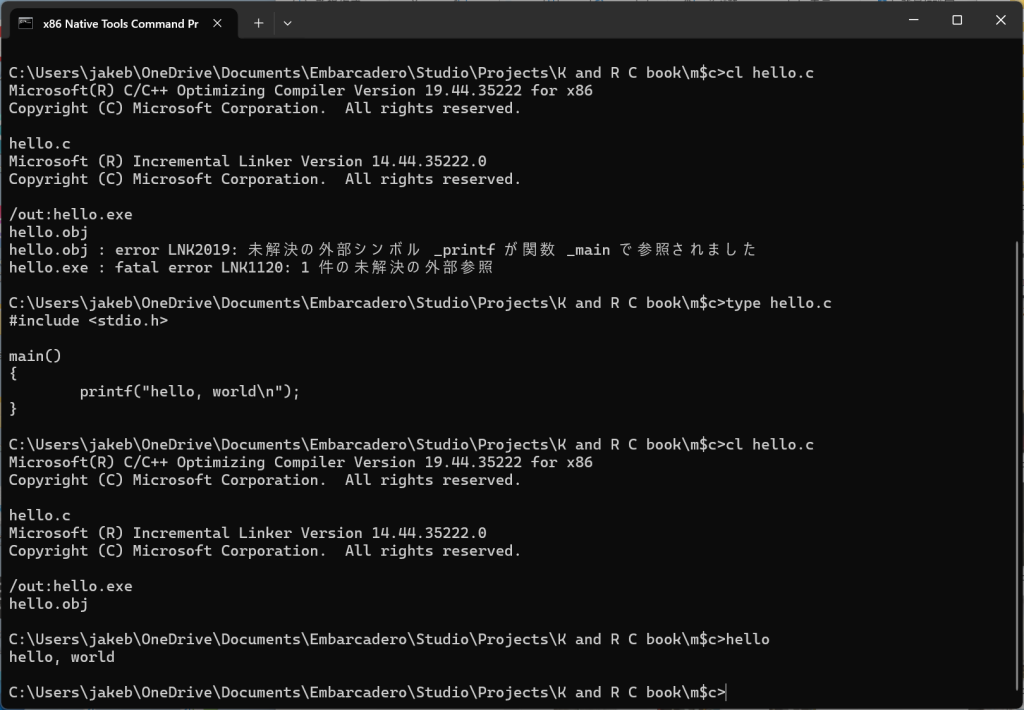 怒られた。hello.cの冒頭に#include <stdio.h>を追加して。再度cl hello.c