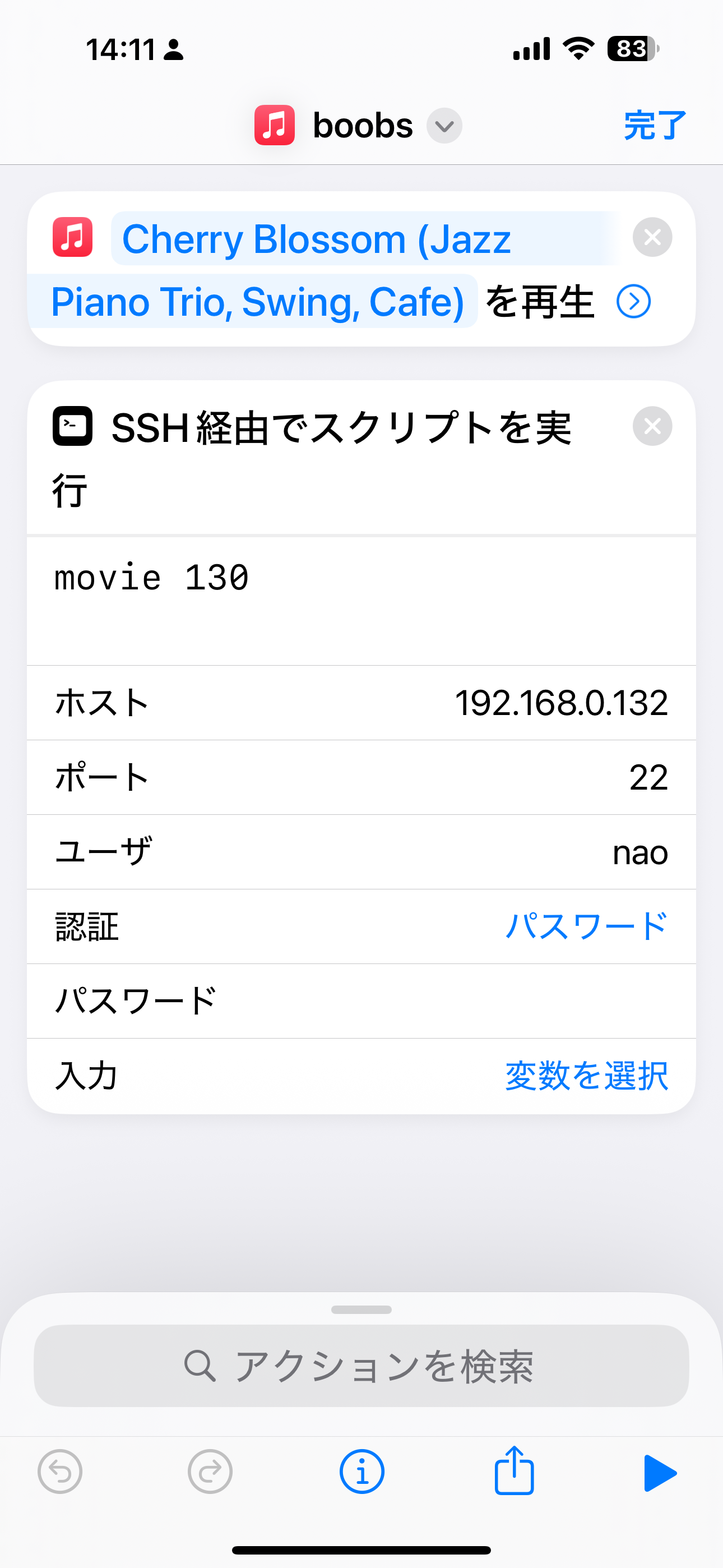 #2 IOS側の設定 何をするのか?やりたいことは、iPhone側で特定の楽曲を再生スタートしたら、PC側に合図を送り、PCにUSB接続したEOSで録画開始するという一連の作業を自動でやりたいということである。前記事ではリモート環境で、iP...