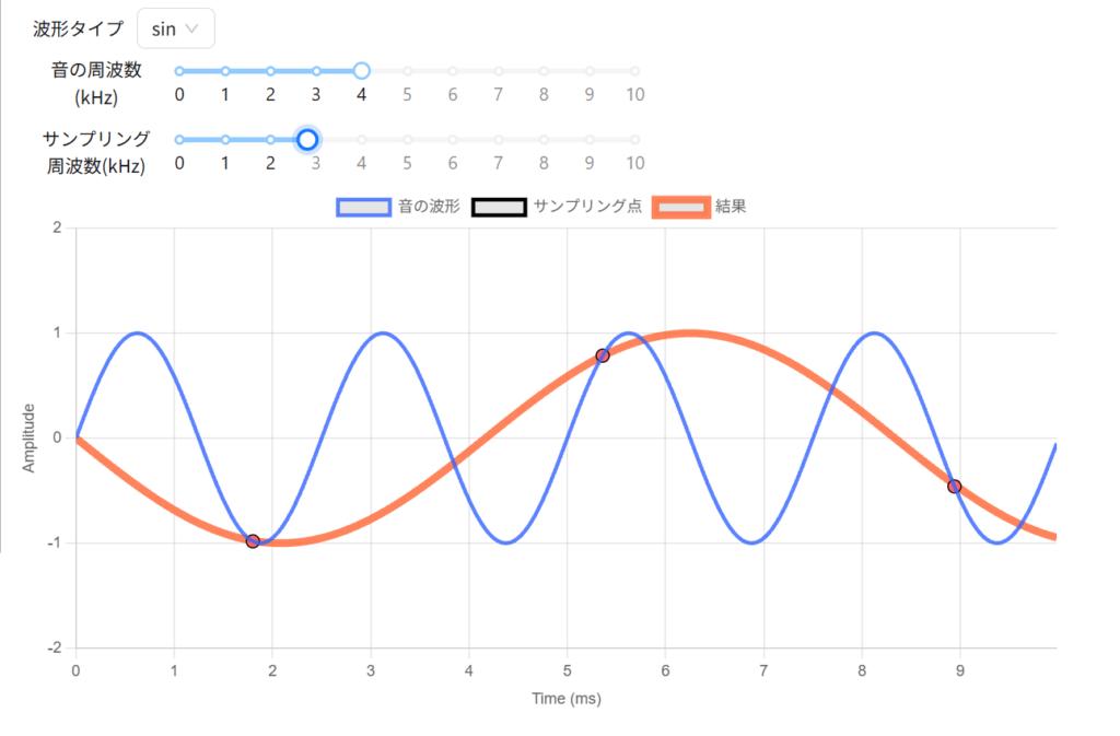 このようになり、もはや音の波形とは形はともかく全く別の周波数の波形として”誤解”することになります。これがエイリアシング誤差です。これはサンプリング周波数が足りない場合に発生するエラーです。時間分解している場合に発生するので、