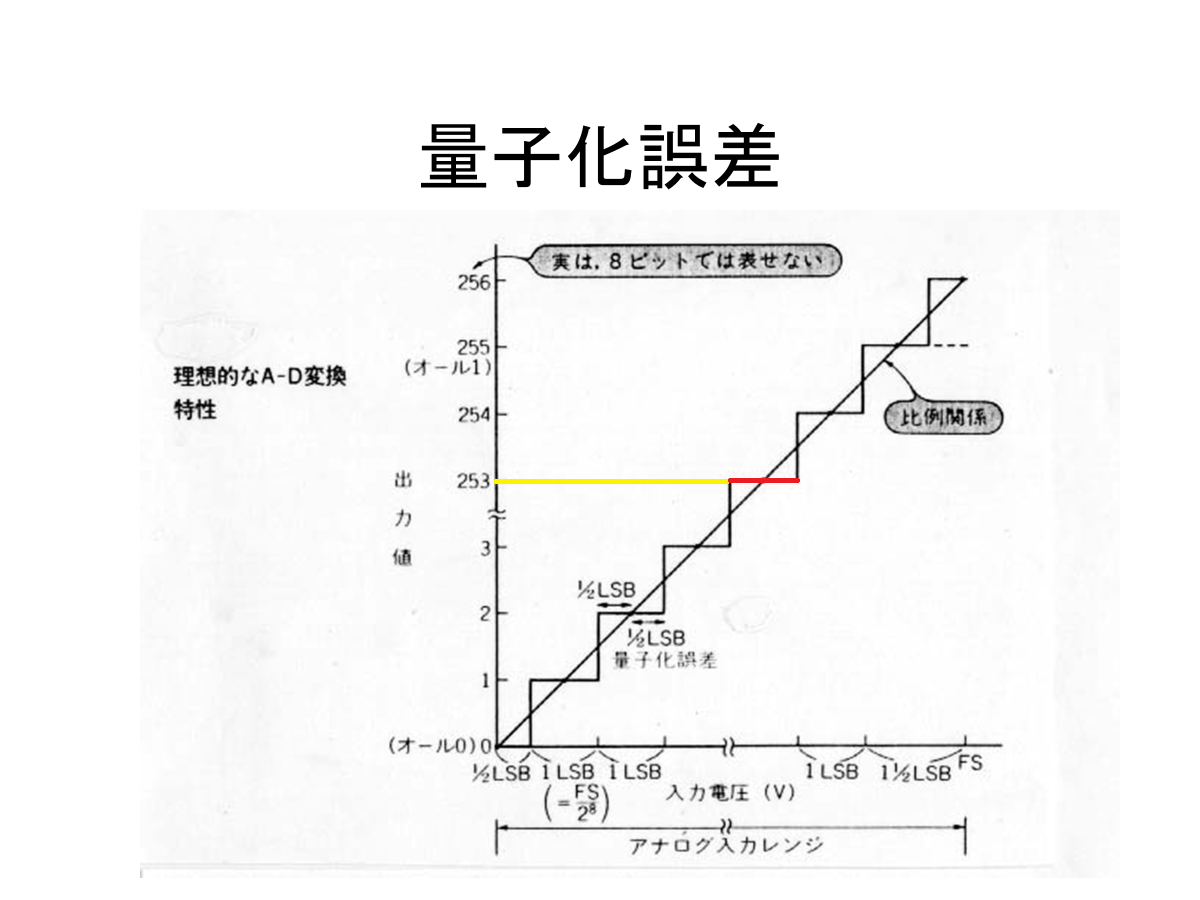 のようになります。今上図のように出力値(AD変換で得られた結果)が253だったとすると、それに対応する入力電圧範囲は幅を持っていて、上図の赤で示した領域に該当します。この範囲の入力電圧は全部253に変換されます。従って、±1/2LSBの誤差を含みます。LSBとはLeast Significant Bitの頭を取ったもので、フルスケール(0~255)を