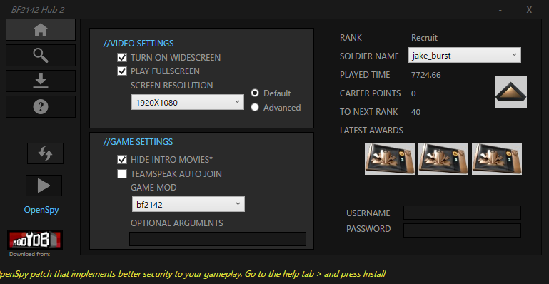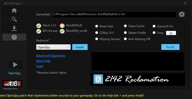 最下行にメッセージが出てますね。いつもはbf2142hub経由しないでクライアント起動しているので、気が付きませんでした。上図で丸に?をクリック。