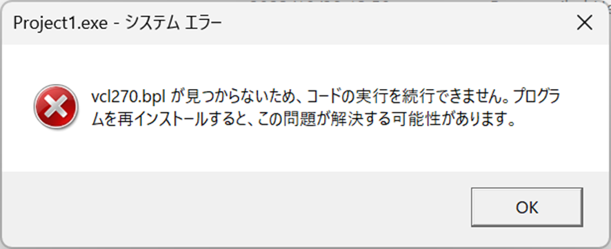 vcl270.bplが見つからないため、コードの実行を続行できません。云々。