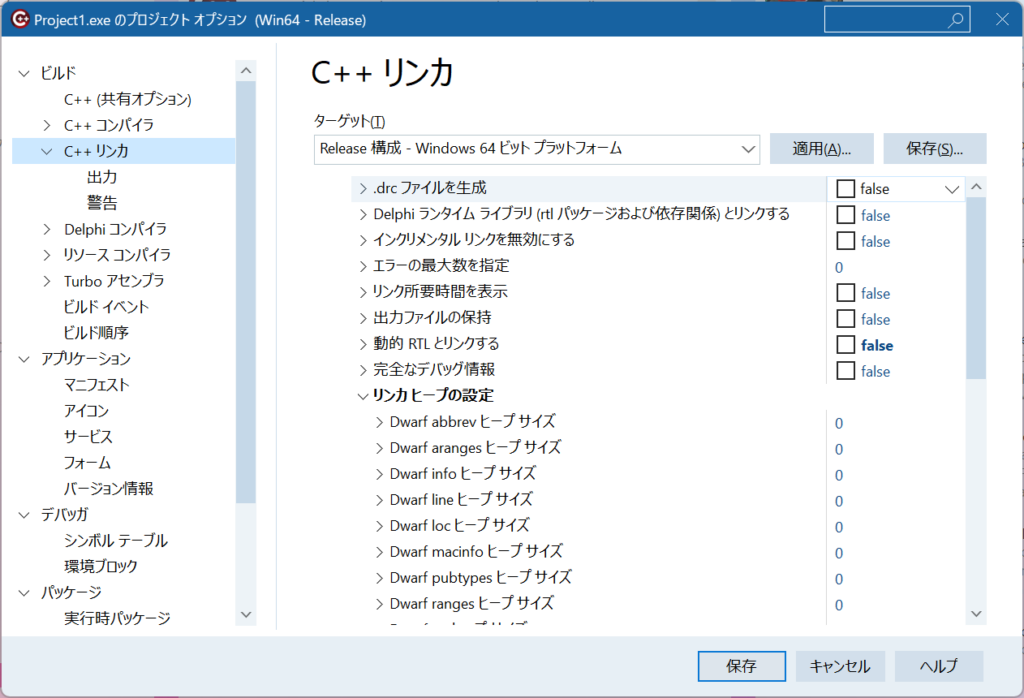 上記のようにビルド->C++ リンカ->動的RTLとリンクするを “false”に、