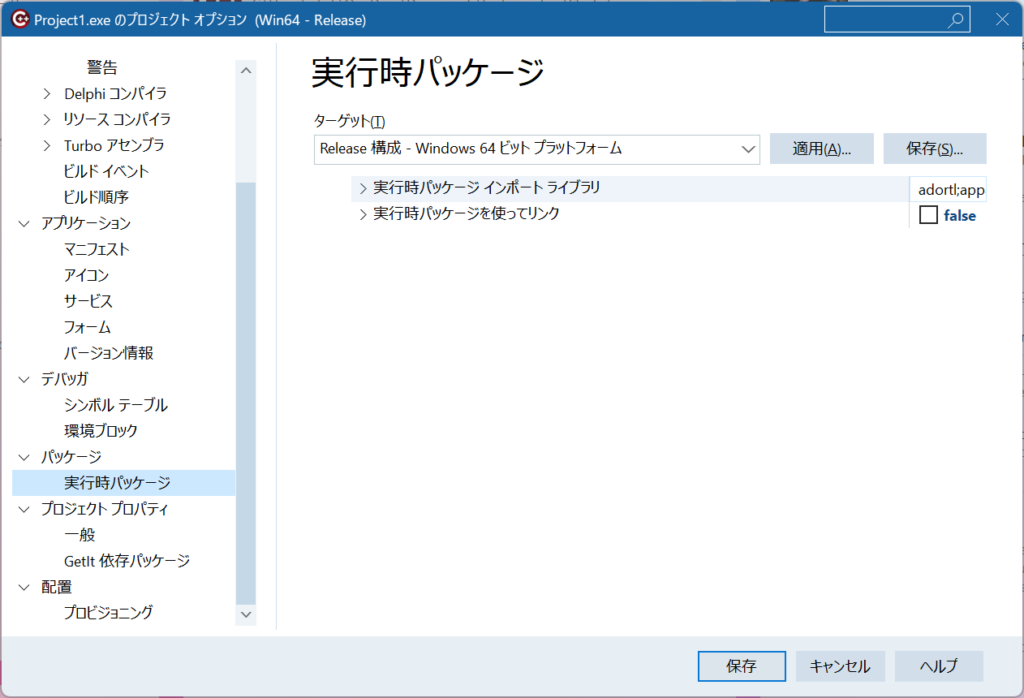 上記のようにパッケージ->実行時パッケージ->実行時パッケージを使ってリンクを”false”に、