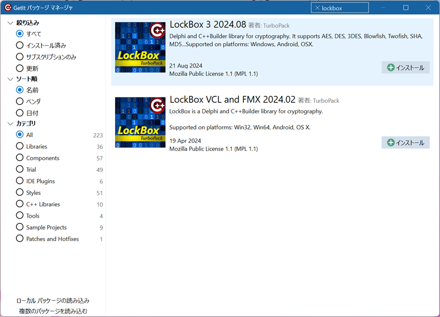 まずLockBox3をインストールする。IDEを起動してGetItからインスト-ルするのだが、IDEのトップメニューのツール->GetItパッケージマネージャーから、
