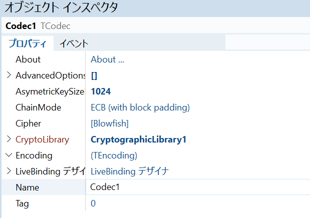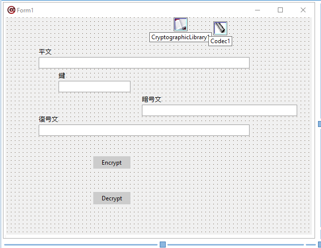 まずフォームを作ります。上記パレットからTCodecとTCryptographicLibraryをフォームにドロップ。他に、LabeledEditx4とButtonx2をドロップ。LabeledEditのLabelは、“平文”,”鍵“、”暗号文”、”復号文”などとして、ボタンのNameは、“Encrypt”と“Decrypt”等でおけ。ここまでで、