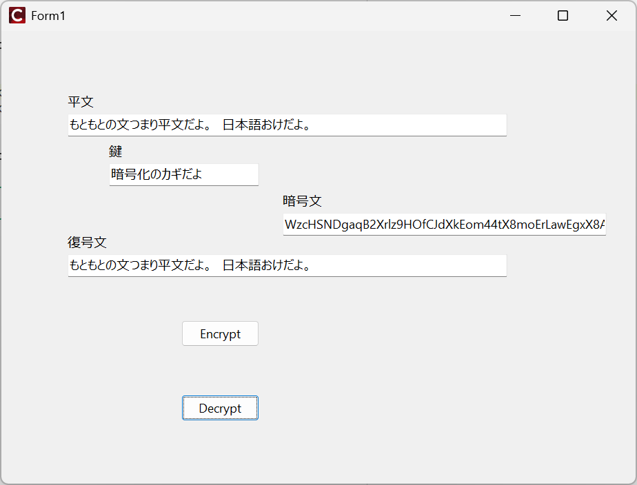 F9押して、実行させてみましょうか。平文に適当に日本語文字列を入れます。空白を含んでいても大丈夫。鍵にはキーフレーズを入れて、Encrypt押すと、暗号文が生成されます。この状態でDecrypt押すと、復号された文が出てきます。これはもちろん最初の平文に一致しています。