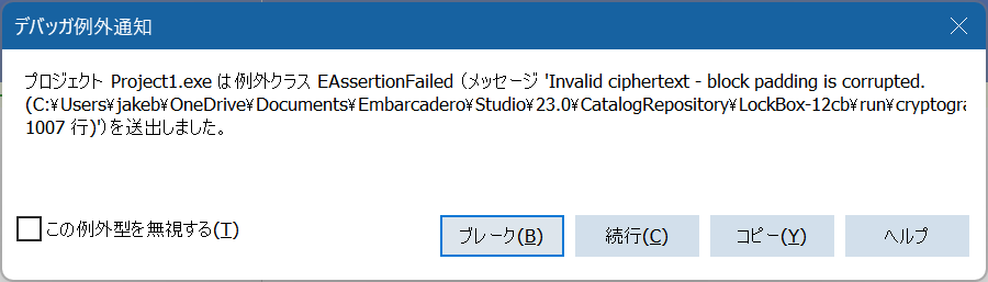 例外が出ました。ま、そうなりますよね。今回は、暗号化のアルゴリズムとしては“BlowFish”をECB(with block padding)モードで使いました。このあたりは、