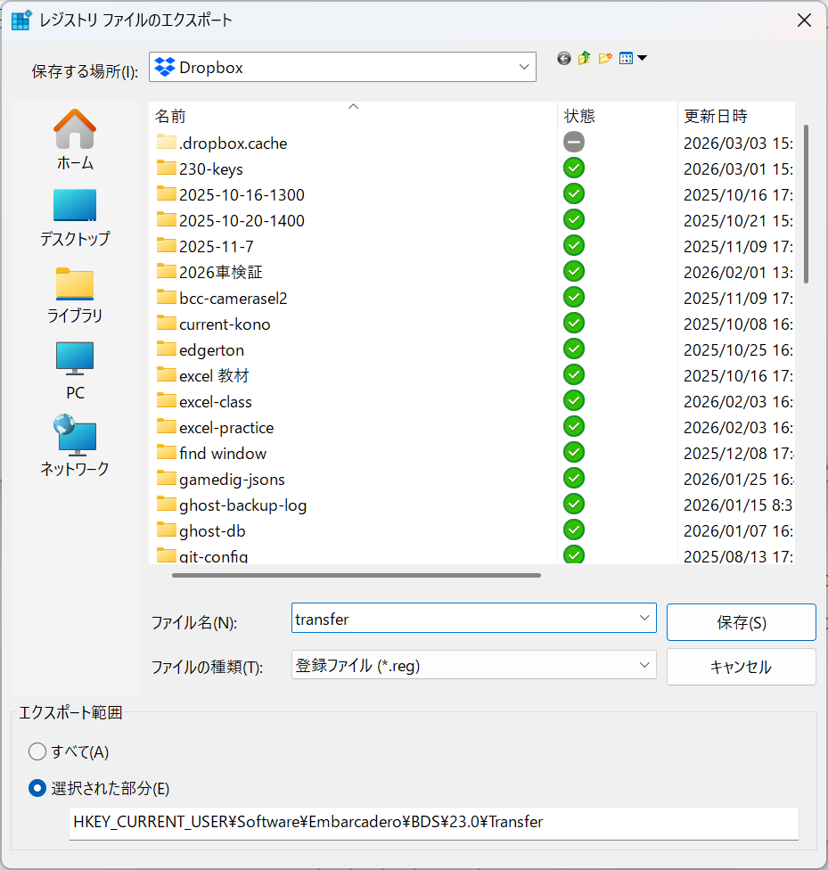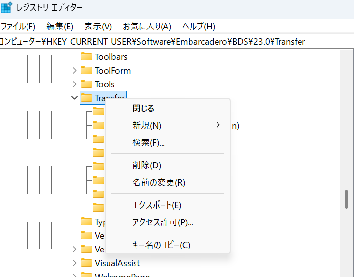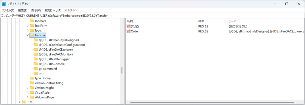 レジストリエディタで HKEY_CURRENT_USER\Software\Embarcadero\BDS\Transfer 以下をエクスポート/インポート