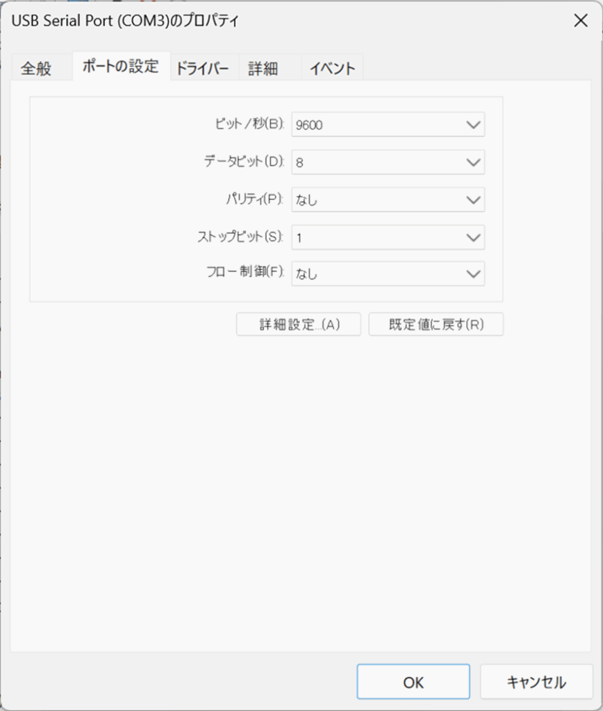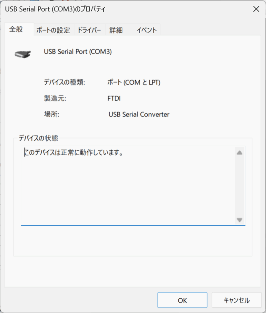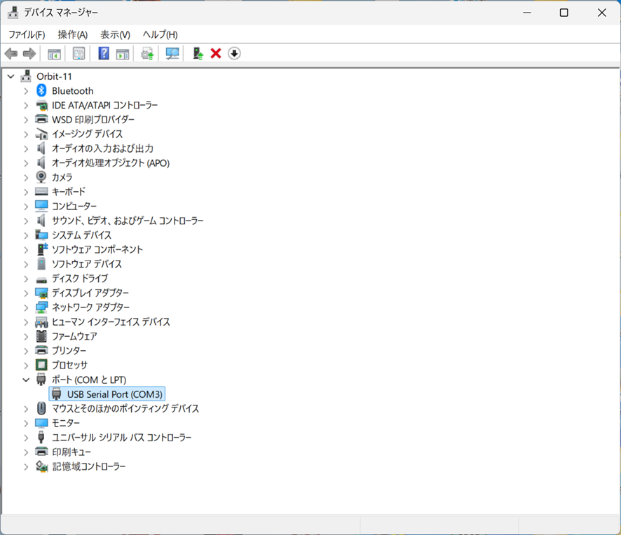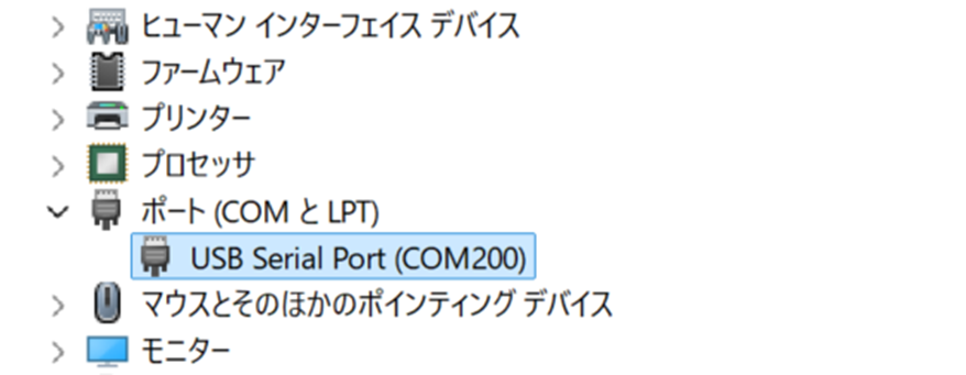 PC側に認識されると、上図のように“PWR”LEDが点灯します。ここでシリアルのポート番号を設定する必要があります。まずWindowsのデバイスマネージャーから、