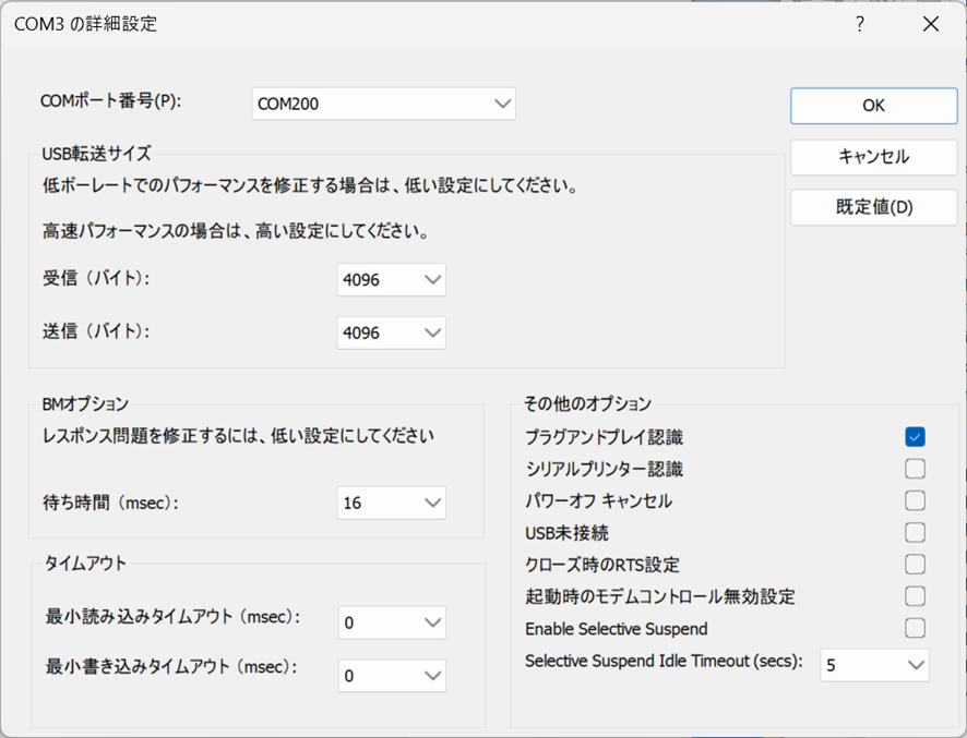 左側一番上を“COM200”へ、で”OK”をクリック、COMポート番号を記録するか所望のものに設定しておく必要があります。筆者は習慣的に200にしています。デバイスマネージャーに戻って、
