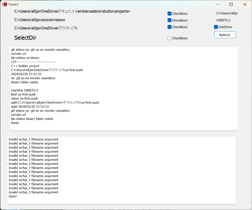 このプログラムは、ハードディスク内部のスタートディレクトリx3を起点として、スキャン(走査)を開始して、再帰的に階層をたどって、そのディレクトリがC++ Builderのディレクトリか、あるいはMSVCのディレクトリかを判定し、プロジェクトファイルのタイムスタンプや、gitでの管理状況、さらにはremote repositoryの有無等を調べて、結果をエクセルのファイルに追記していくものである。結果の一例は、