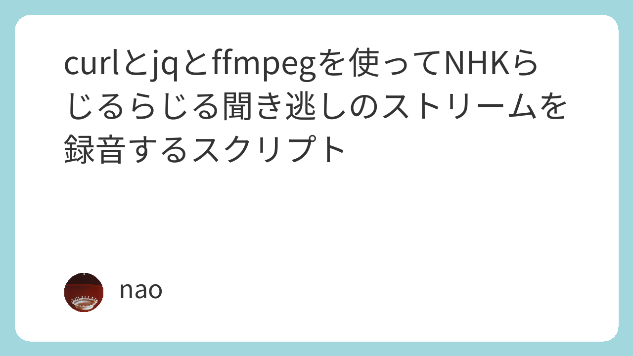 c:/ffmpeg/bin/ffmpeg -loglevel quiet -y -http_seekable 0 -i ${temp} -vn -bsf aac_adtstoasc -acodec copy "${OUTDIR}/${temp2}.m4a"あと最終行のffmpegの呼び出しは、ffmpegの在処を示してください。他にjqも必要ですが、Windowsのバイナリをパスの通った所においてください。jqは、
