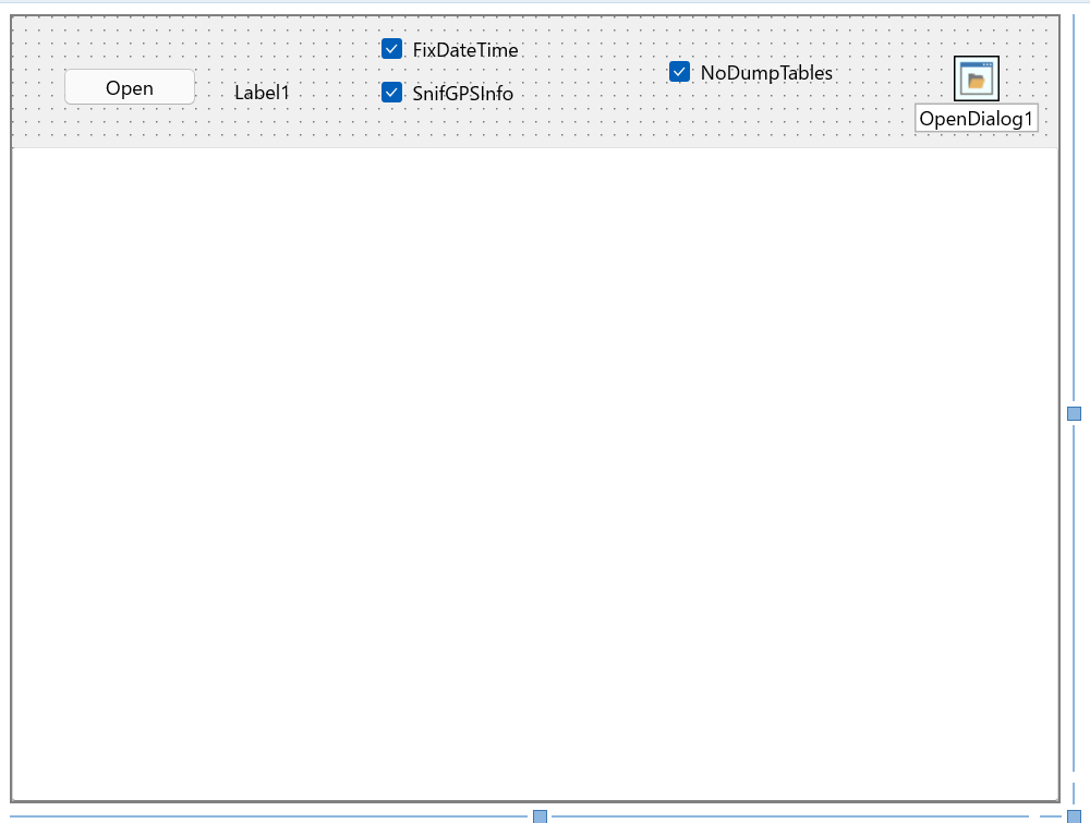 このようにTButtonx1,TLabelx1,TCheckboxx3,TOpenDialogを配置。適宜Nameを変更して、Unit1.hは、