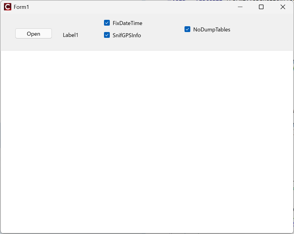 となるので、作成日時をExif内部の撮影日時にセットするならば、FixDateTimeにチェック(デフォルト)、Exif内部のGPS情報を切るのであれば、SnifGPSInfoにチェック(これまたデフォルト)、Exifテーブルを表示しないのであれば、NoDumpTablesにチェック(デフォルト)で“Open”します。ファイルを選択すると、ファイル処理して、Exif情報をいじる場合は、