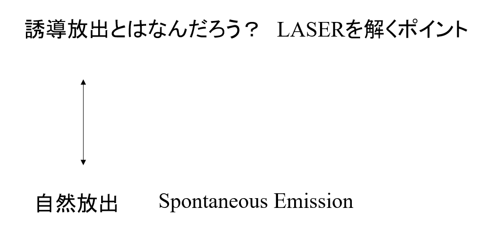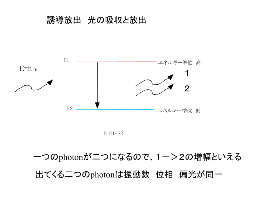 誘導放出(Stimulated Emission of Radiation)です。電子が高い方のエネルギー準位に在るときに、ちょうどエネルギーギャップに等しい振動数を持った光が到来すると、電子は準位間をドロップして、光子は二つになります。この時出てくる二つの光子は、振動数、位相、偏光が同じものになり、正確な複製(cloneと言った方が今時は理解しやすいかな?)になります。1が2になりますから、見事に増幅されていることになります。もの凄く単純化すると、これがLASERの動作原理です。ということで、LASERの構成要素は、