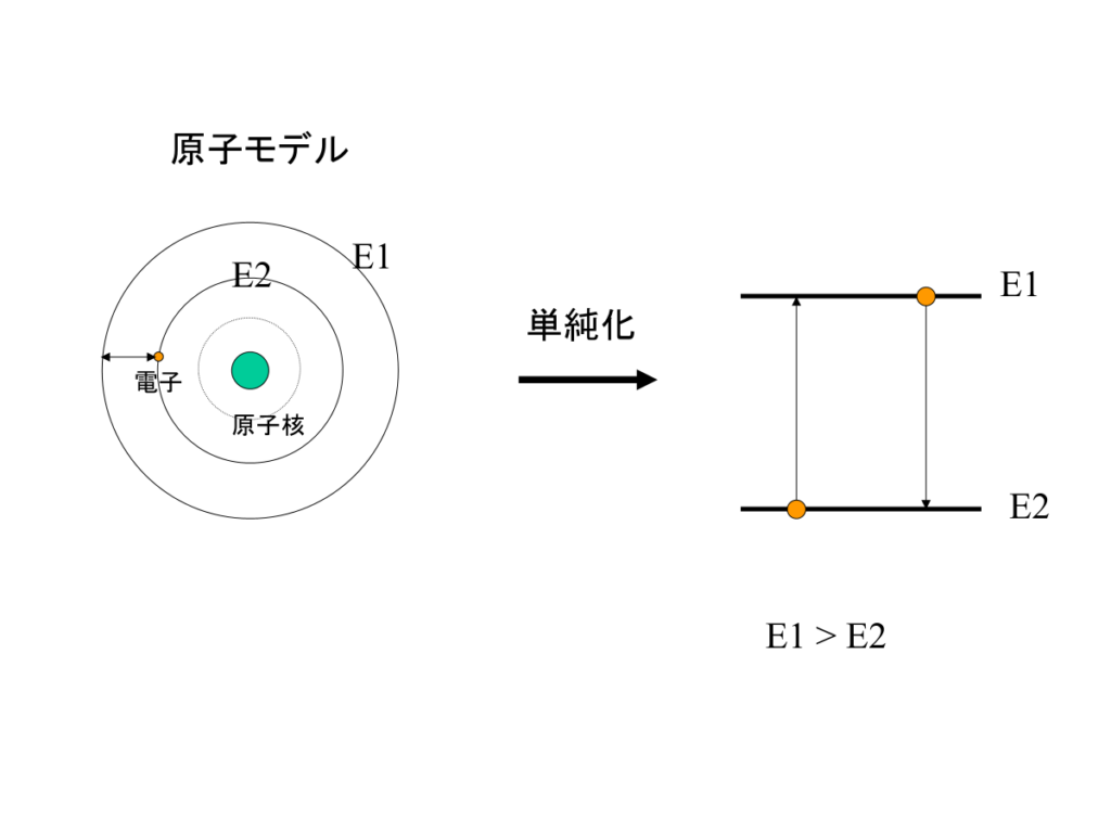 今単純化のために、電子が周回している軌道はE1とE2だけとします。その時に、さらに単純化すると右側の図のようになります。ここで、