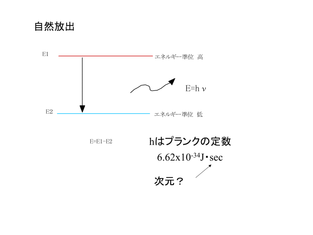 電子が高い方のエネルギー準位E1から低い方の準位E2へ移る時エネルギーの差分に相当する光が放出されます。これが自然放出で、確率的に起こる現象です。逆に、