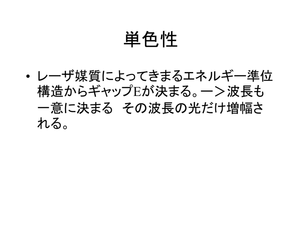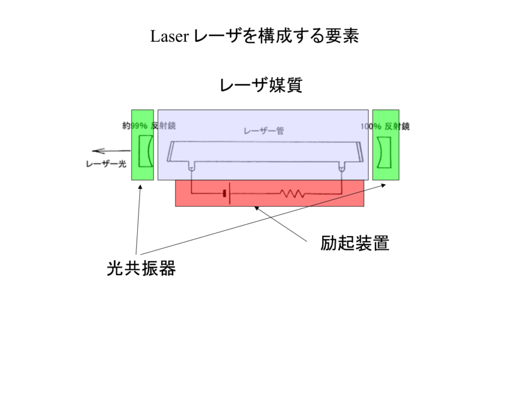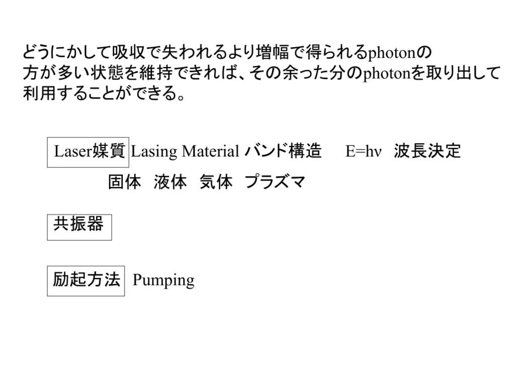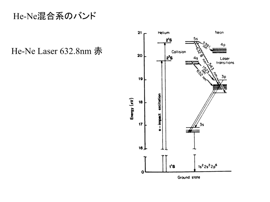 のように、LASER現象を起こす媒質(気体、固体、液体、プラズマ)、光共振器、励起方法が重要です。実際は、よくみかけるHe-Neレーザーでさえ、そのエネルギーバンド図は、