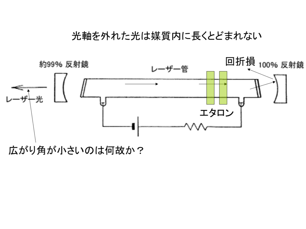 上図のように光軸から外れた光は、長く共振器内に留まれず、回折損として消えゆくからです。上図のように、光共振器内にさらに平面平行板(エタロン)を入れると、波長がさらに選択されて波長の単一性が増し、結果としてレーザー光のコヒーレンスが向上します。Arイオンレーザー等でこの機構を使います。コヒーレンスというのは、波長単一性であり、それゆえ可干渉性とも言えます。別記事で述べるかもしれないホログラフィーなどではこの性質が必要です。レーザーは基本的にその物理現象(誘導放出)ゆえに、出てくる光の単色性は強いわけです、
