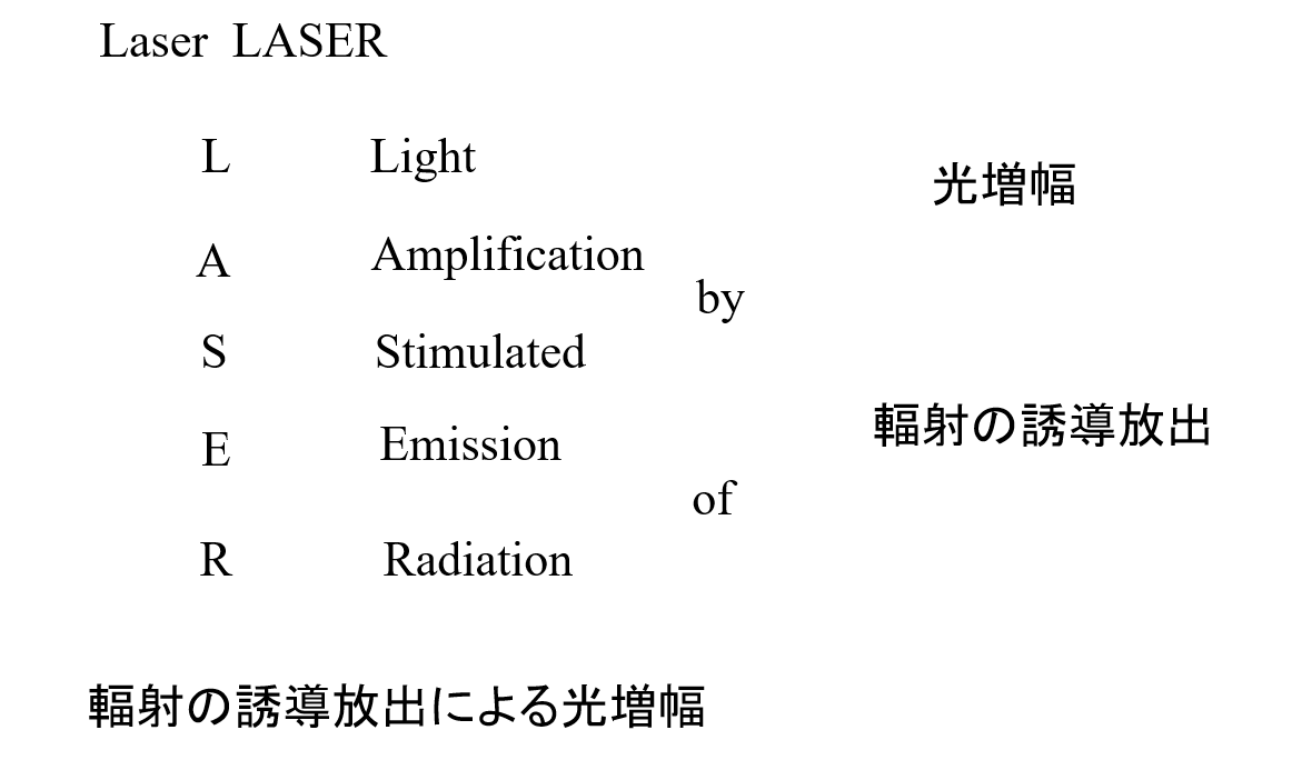 直訳すれば上図のように、輻射の誘導放出による光増幅ということになります。これは現象のほうであって、LASER装置であれば、輻射の誘導放出による光増幅器を指すことになります。