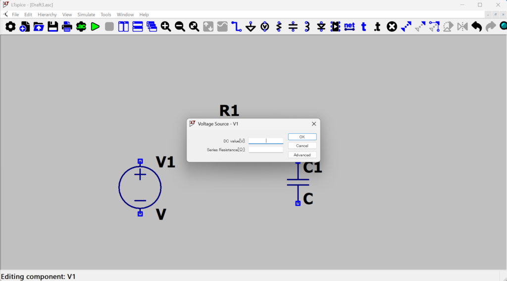 Voltage Source V1については、上図でさらにAdvancedをクリック。