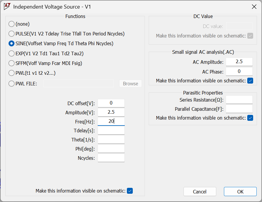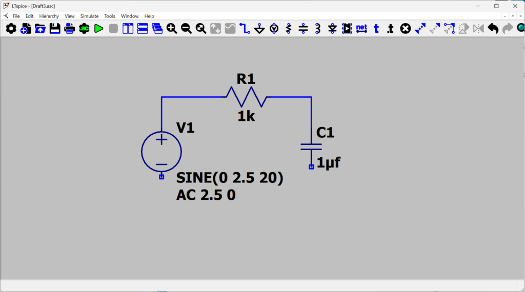 後で変更するが、とりあえず”SINE”を選択しておく。で、OK。CとRも実験の際の値にしておこう。Rが1kΩ、Cが1μFだが、そのままダイアログに入れられる。その状態が、