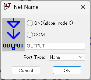 GNDがないと気持ち悪いので、入力側と出力側に足しておきましょう。INPUTとOUTPUTというラベルも付けておきましょう。