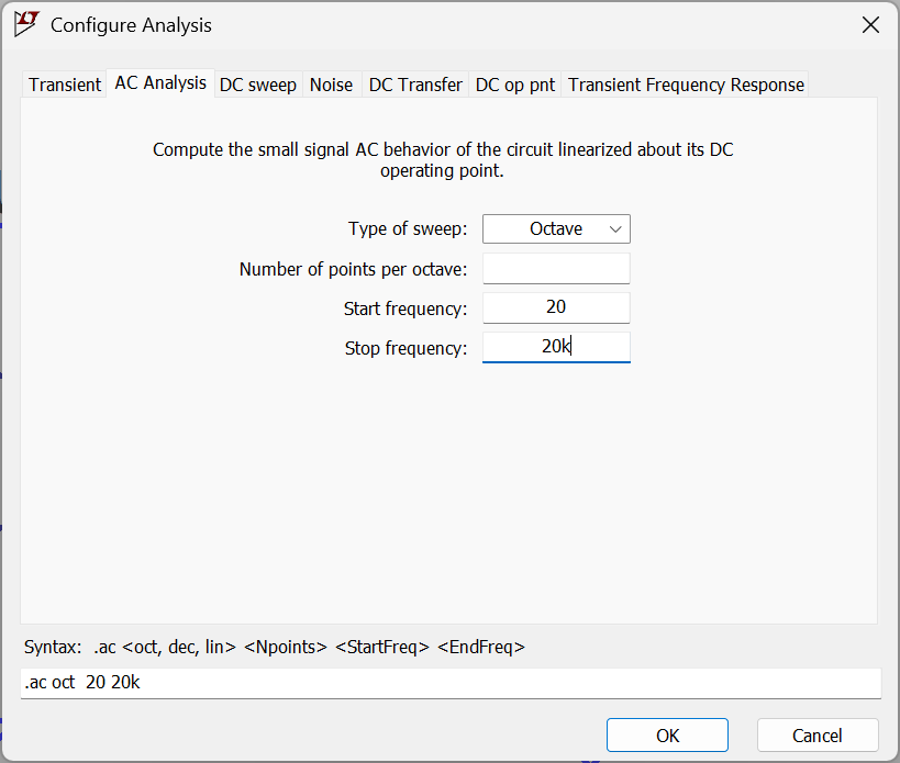 シミュレーションのパラメータを設定します。AC Analysisから下図のように。今はオーディオ帯域を仮定して、20~20KHzの範囲。周波数応答を表示したいので、Type of sweepはOctave(オクターブ)つまり周波数は対数プロット。