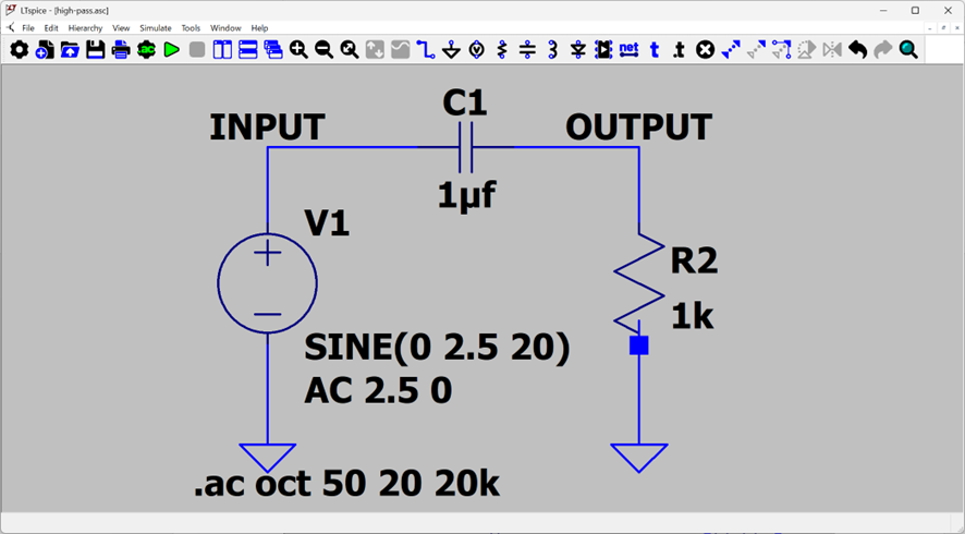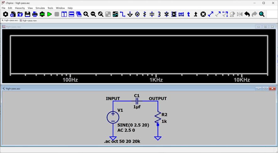 LTspiceを使うとアナログ回路のシミュレーションがある程度簡単(慣れるまで時間がかかるかも)にできる。4端子回路のCとRを使ったハイパスフィルターを具体的な題材として試してみよう。まずLTspiceを起動する。インストールなどは他のサイトを参考のこと。