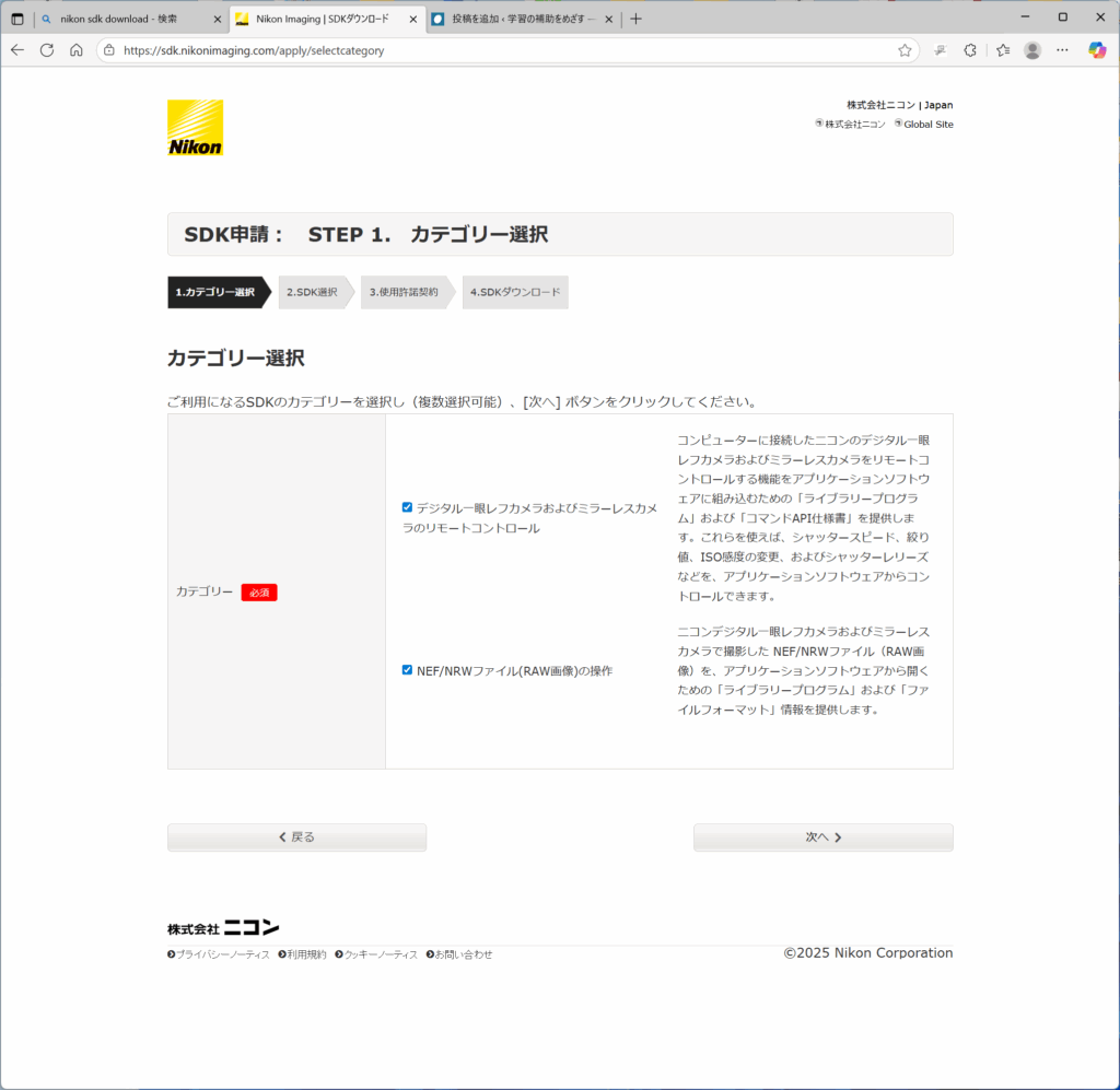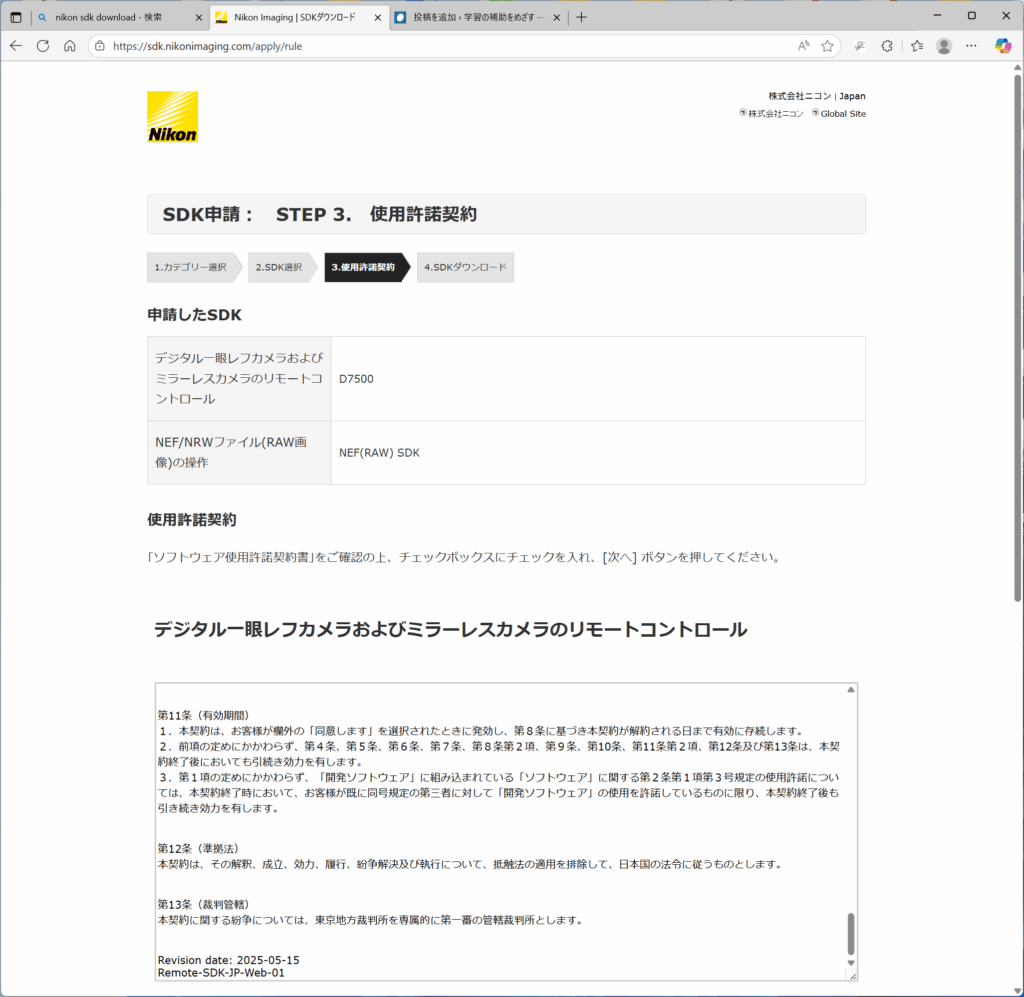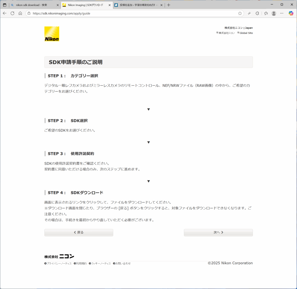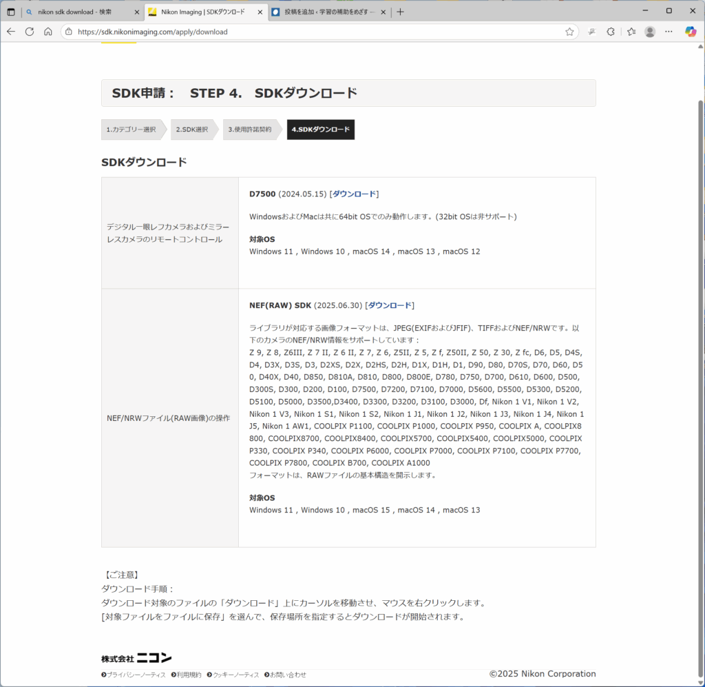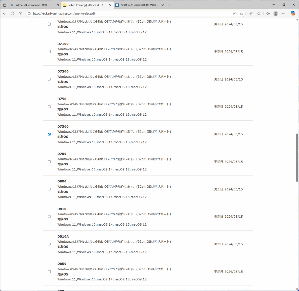 お持ちのNikonのカメラがリストにあれば使える可能性があります。ただしNikonのSDKはいつのころからか64ビット版オンリーになったので注意してください。筆者のカメラはD7500なので、該当します。下の方へ行って、”次へ”、