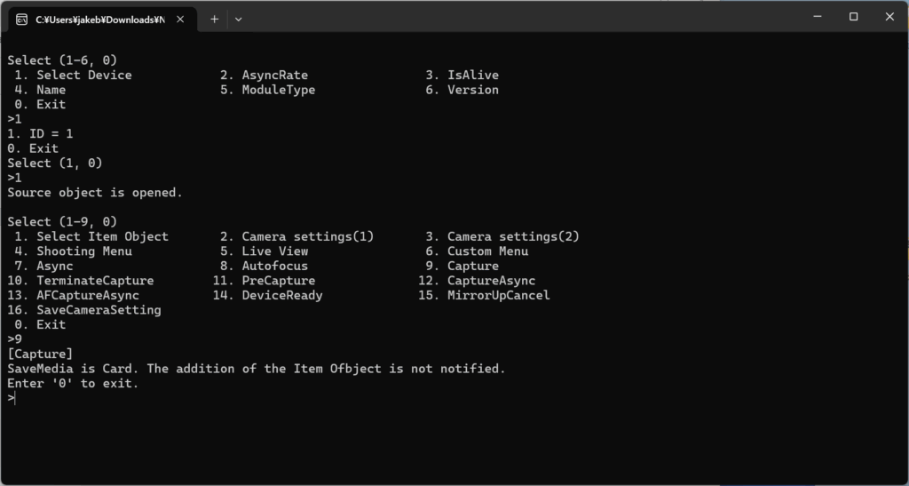 Select Deviceして、Captureしてみました。”SaveMedia is Card”と言ってるので、カメラ内のSD Cardに画像がセーブされたようです。一応の動作は確認できました。Visutal Studio 2022があれば、ブレークポイント等を使いながら動作を追いかけることができます。