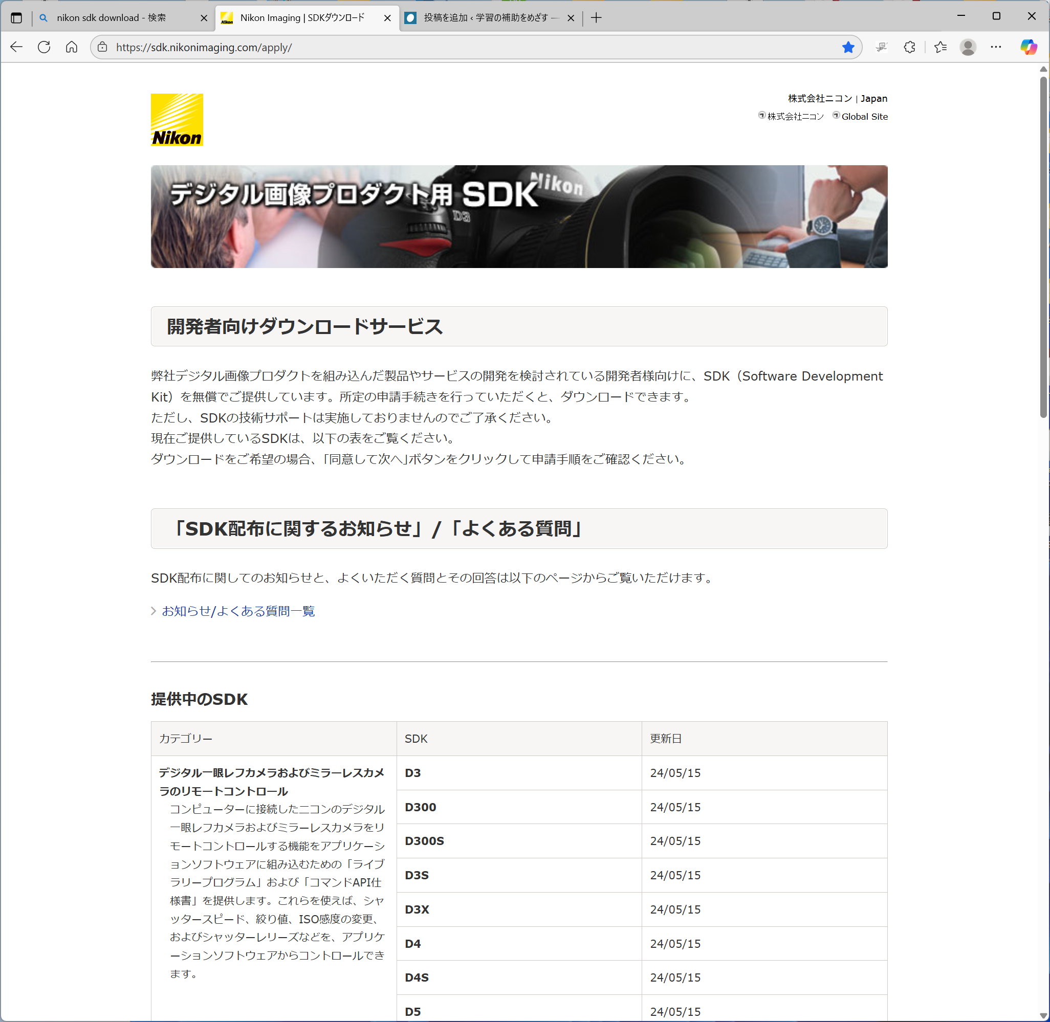 お持ちのNikonのカメラがリストにあれば使える可能性があります。ただしNikonのSDKはいつのころからか64ビット版オンリーになったので注意してください。筆者のカメラはD7500なので、該当します。下の方へ行って、”次へ”、
