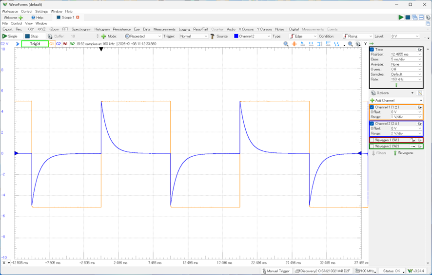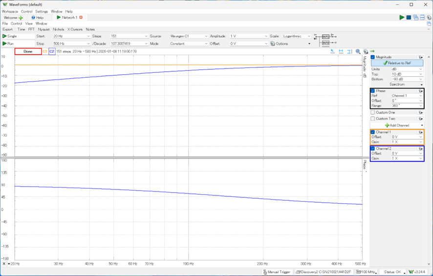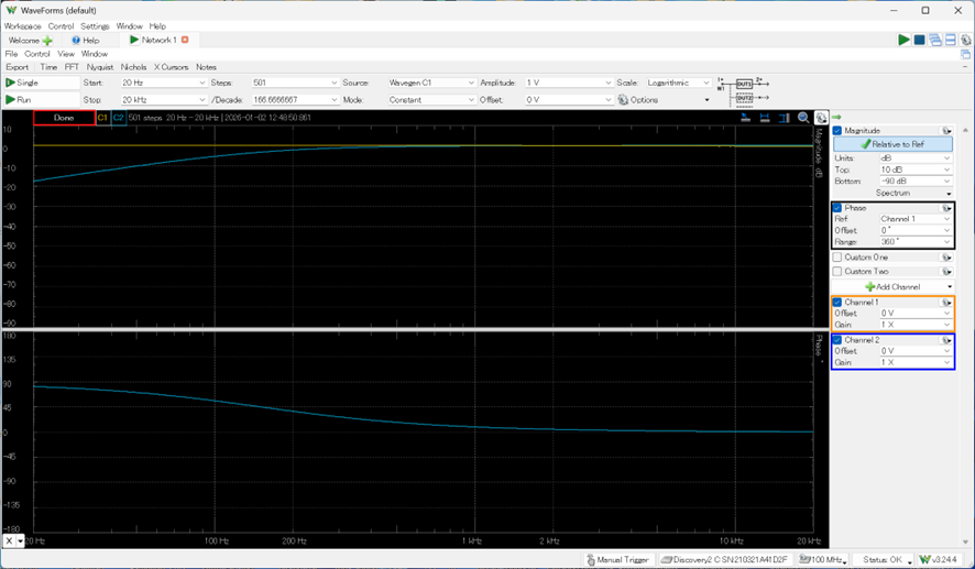 Analog Discovery 2に接続して、周波数応答を調べます。