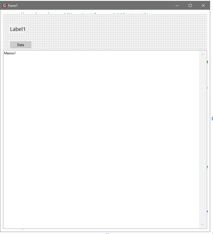 こんな感じです。TLabelx1,TButtonx1,TMemox1を上図のように配置。忘れずにMemo1には垂直スクロールをセットしておきましょう。