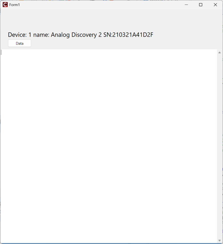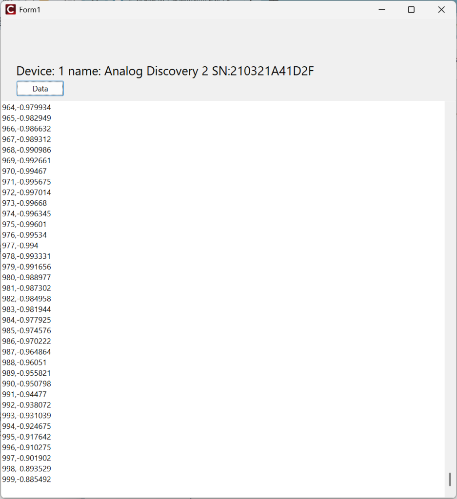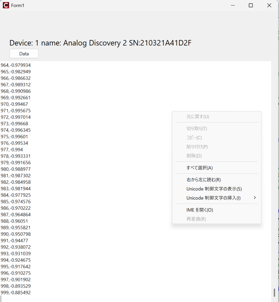 コンストラクタ内でAD2を認識し、SNを表示しています。公開しちゃってますが、大丈夫でしょう。ここで”Data”ボタンをクリックすると、